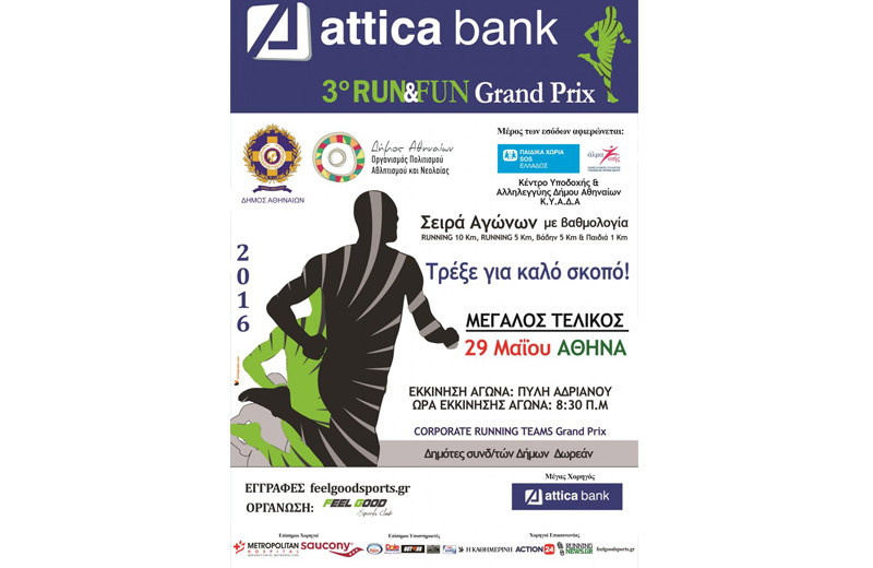 Ο Οργανισμός Πολιτισμού  Αθλητισμού & Νεολαίας του Δήμου Αθηναίων και ο αθλητικός σύλλογος «Η ΕΥΕΞΙΑ» (Feel Good Sports Club) διοργανώνουν το 3ο Fun & Run Grand Prix που θα γίνει στην πιο όμορφη διαδρομή της Αθήνας την Κυριακή  29 Μαΐου 2016 με εκκίνηση στις 8.30π.μ. από την Πύλη Ανδριανού. Συμμετέχουν οι πρωταθλητές η Αναστασία Καρακατσάνη, ο Κώστας Πούλιος, ο Γιώργος Μενής, ο Αλέξανδρος Πιπερής, η Angelina Navaro, ο Φώτης Ρηγόπουλος και η Χριστίνα Σαμπατακάκη και στηρίζουν τα Παιδικά Χωριά SOS, το Κέντρο Υποδοχής & Αλληλεγγύης Δήμου Αθηναίων Κ.Υ.Α.Δ.Α. και το ΑΛΜΑ ΖΩΗΣ.  Η πορεία διαδρομής του αγώνα ξεκινάει μέσα από την Πλάκα, Μητροπόλεως, Μοναστηράκι, Κεραμεικός (δίπλα από τα αρχαιολογικά ευρήματα της Αρχαίας Αθήνας) με επιστροφή Θησείο, Διονυσίου Αρεοπαγίτου μπροστά από την Ακρόπολη με κατεύθυνση προς Πύλη Αδριανού τερματισμός για τα 5 χλμ. diadromi_athens_site Μέρος των εσόδων θα δωθεί στα Παιδικά Χωριά SOS, ΑΛΜΑ ΖΩΗΣ, Κέντρο Υποδοχής & Αλληλεγγύης Δήμου Αθηναίων Θα λάβουν μέρος Ολυμπιονίκες, πρωταθλητές μεγάλων αποστάσεων Running Teams, running clubs κλπ. Θα υπάρξουν πολλά δώρα (T-Shirts, εργομετρικές αξιολογήσεις ERGO LIFE, δωρεάν προπονητικές αξιολογήσεις με κλήρωση!). Ακόμα για όλους τους συμμετέχοντες δρομείς θα υπάρξουν αναμνηστικά μετάλλια, ειδικά σχεδιασμένα για τον αγώνα. Όλοι οι δημότες Αθηναίων μπορούν να συμμετάσχουν ΔΩΡΕΑΝ στον τελικό του αγώνα, που θα διεξαχθεί στις 29 Μαΐου 2016 στην Αθήνα! Για εγγραφές στον τελικό αγώνα ATTICA BANK 3o RUN&FUN Grand Prix στην Αθήνα πατήστε εδώ. Οι εγγραφές στον αγώνα κλείνουν στις 25.5.2016 στις 17:00 Εκκίνηση - Τερματισμός: Πύλη Αδριανού Ώρα εκκίνησης αγώνα: 08:30 π.μ.