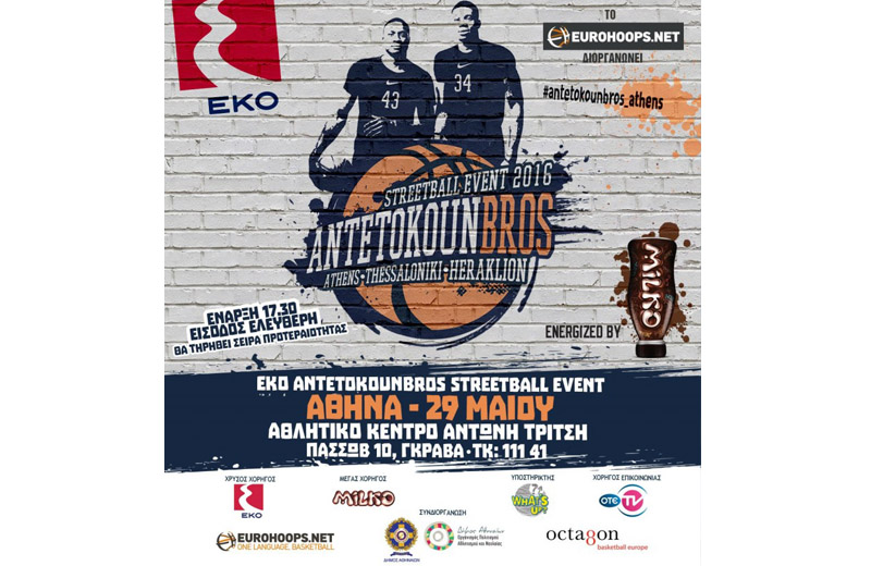 Ο Οργανισμός Πολιτισμού, Αθλητισμού και Νεολαίας του Δήμου Αθηναίων και το Eurohoops.net συνδιοργανώνουν το EKO Antetokounbros Streetball Event 2016 της Αθήνας. Μετά το επιτυχημένο πέρασμα του event από το Ηράκλειο της Κρήτης και την απίστευτη κοσμοσυρροή στο Αλεξάνδρειο Μέλαθρο της Θεσσαλονίκης, ο Γιάννης και ο Θανάσης Αντετοκούνμπο σας περιμένουν όλους στην Αθήνα, την Κυριακή 29 Μαΐου στις 17:30 στις Αθλητικές Εγκαταστάσεις της Γκράβας του Δήμου Αθηναίων (Πασσώβ 10) για να τους παρακολουθήσετε ή ακόμα και να έρθετε αντιμέτωποι μαζί τους! Οι αστέρες του παγκόσμιου μπάσκετ και του NBA, θα βρεθούν στη Αθήνα για να δώσουν χαρά σε μικρούς και μεγάλους στο μεγαλύτερο event του καλοκαιριού, που στόχο έχει να γίνει ένας κοινωνικός θεσμός ανεξίτηλος στο χρόνο. Μέσα από αυτόν τον θεσμό, ο Γιάννης και ο Θανάσης Αντετοκούμπο επιστρέφουν στον τόπο που μεγάλωσαν , παίζουν μπάσκετ στους δρόμους που έριξαν τα πρώτα τους… καρφώματα, ονειρεύονται να προσφέρουν στην ελληνική κοινωνία και να οργώσουν όλα τα μήκη και τα πλάτη της χώρας. Ο Θανάσης και ο Γιάννης θα παίξουν μπάσκετ (4 δεκάλεπτα) με τους φίλους τους, χωρισμένοι σε δύο ομάδες. Στο περιθώριο του αγώνα, ο κόσμος θα έχει την ευκαιρία να συμμετάσχει σε πολλούς διαγωνισμούς - εκπλήξεις, με τους νικητές να λαμβάνουν σημαντικά δώρα, από τους χορηγούς του Event! Τα αδέλφια Αντετοκούνμπο, θα συμμετέχουν ενεργά στους διαγωνισμούς, ενώ ο κόσμος που θα βρεθεί δίπλα τους, θα έχει την ευκαιρία να παίξει, να φωτογραφηθεί μαζί τους και να πάρει αυτόγραφα. Ο Γιάννης και ο Θανάσης σας περιμένουν για ένα αξέχαστο απόγευμα και να είστε σίγουροι ότι μέσα στο γήπεδο, δεν υπάρχουν... συγγένειες! Στην Θεσσαλονίκη μάλιστα, ο Γιάννης κέρδισε τον Θανάση καθώς είχε την βοήθεια του βετεράνου Θοδωρή Παπαλουκά. Ποια έκπληξη του επιφυλάσσει ο Θανάσης για το event της Αθήνας? Αν θες να κερδίσεις μία θέση στο παρκέ και να παίξεις συμπαίκτης των Antetokounbros, μπες ΕΔΩ και πάρε μέρος στο διαγωνισμό! Σας περιμένουμε όλους την Κυριακή 29 Μαΐου στο Αθλητικό Κέντρο της Γκράβας του Δήμου Αθηναίων! Είσοδος Ελεύθερη, θα τηρηθεί σειρά προτεραιότητας