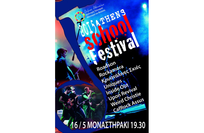 Σε μία μεγάλη μουσική σκηνή θα μετατραπεί η πλατεία Μοναστηρακίου το Σάββατο 16 Μαΐου στις 7.30μ.μ., φιλοξενώντας μαθητικά συγκροτήματα του 7ου Athens School Festival, που θα εντυπωσιάσουν με το ταλέντο και τη ζωντάνια τους το κοινό που θα παρευρεθεί. Το Athens School Festival αποτελεί ένας νεανικό μουσικό θεσμό, που γνωρίζει μεγάλη επιτυχία, στον οποίο συμμετέχουν μαθητές Γυμνασίων και Λυκείων της Αθήνας. Κάθε συναυλία του Athens School Festival είναι μια πρωτόγνωρη εμπειρία για τα μαθητικά συγκροτήματα που συμμετέχουν και αναδεικνύει τις μουσικές τους ικανότητες και την αγάπη τους για τη μουσική. Οι μαθητές ανεβαίνοντας στη σκηνή με κοινό κώδικα τη μουσική, αφουγκράζονται την εποχή τους και στέλνουν τα δικά τους μηνύματα. Με τη συναυλία στην πλατεία Μοναστηρακίου κλείνει ο κύκλος των lives, που προηγούνται των δύο μεγάλων τελικών συναυλιών στην Τεχνόπολη του Δήμου Αθηναίων στις 19 και 20 Ιουνίου, με τις οποίες το 7ο Athens School Festival φθάνει στο αποκορύφωμά του. Τα συγκροτήματα που θα ακούσετε στην πλατεία Μοναστηρακίου: Roadson Rockamora Κρυστάλινες Σκιές Uniques Inside Out Upon Revival Weird Christie CafRock Assus Η είσοδος για το κοινό είναι ελεύθερη.
