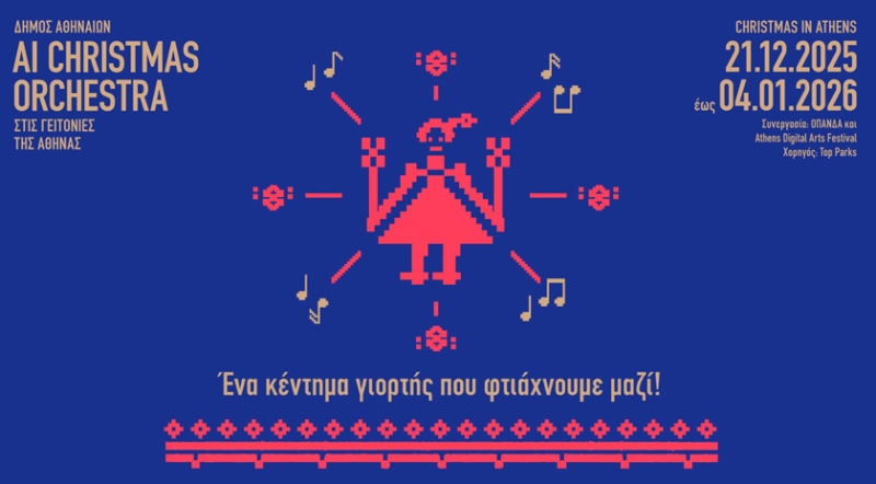 Ο Οργανισμός Πολιτισμού, Αθλητισμού και Νεολαίας Δήμου Αθηναίων ενημερώνει το κοινό ότι η εκδήλωση «AI Christmas Orchestra στις γειτονιές της Αθήνας» στο πλαίσιο των χριστουγεννιάτικων εκδηλώσεων του Δήμου Αθηναίων «Χριστούγεννα στην Αθήνα», ακυρώνεται λόγω τεχνικού κωλύματος την Παρασκευή 02.01.2026 στην οδό Αντιγόνης (έμπροσθεν μετρό Σεπόλια), το Σάββατο 03.01.2026 στην Πλατεία Αγίου Παύλου και την Κυριακή 04.01.2026 στις πλατείες Αγίας Αικατερίνης (Πετράλωνα) και Καραμανλάκη.