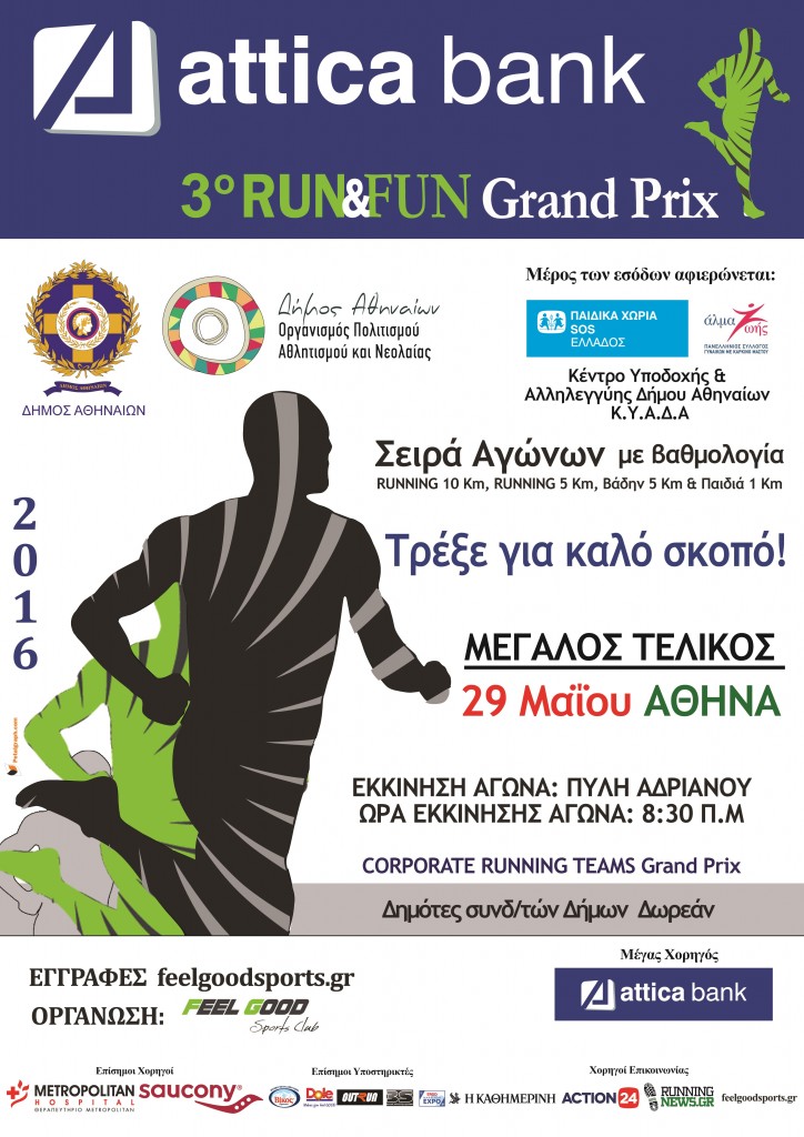 Ο Οργανισμός Πολιτισμού  Αθλητισμού & Νεολαίας του Δήμου Αθηναίων και ο αθλητικός σύλλογος «Η ΕΥΕΞΙΑ» (Feel Good Sports Club) διοργανώνουν το 3ο Fun & Run Grand Prix που θα γίνει στην πιο όμορφη διαδρομή της Αθήνας την Κυριακή  29 Μαΐου 2016 με εκκίνηση στις 8.30π.μ. από την Πύλη Ανδριανού. Συμμετέχουν οι πρωταθλητές η Αναστασία Καρακατσάνη, ο Κώστας Πούλιος, ο Γιώργος Μενής, ο Αλέξανδρος Πιπερής, η Angelina Navaro, ο Φώτης Ρηγόπουλος και η Χριστίνα Σαμπατακάκη και στηρίζουν τα Παιδικά Χωριά SOS, το Κέντρο Υποδοχής & Αλληλεγγύης Δήμου Αθηναίων Κ.Υ.Α.Δ.Α. και το ΑΛΜΑ ΖΩΗΣ.