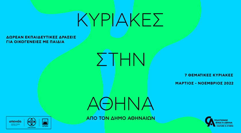 Στο πλαίσιο της δράσης για οικογένειες και παιδιά «Κυριακές στην Αθήνα» που εγκαινιάστηκε με μεγάλη επιτυχία τον Μάρτιο, ο Δήμος Αθηναίων προσκαλεί και πάλι μικρούς και μεγάλους σε επιλεγμένους πολιτιστικούς χώρους την Κυριακή 17 Απριλίου 2022 για να ανακαλύψουν αυτή τη φορά τις τέχνες, μέσα από ψυχαγωγικές δραστηριότητες δημιουργικής μάθησης, με ελεύθερη συμμετοχή.