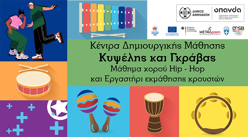 Στο πλαίσιο υλοποίησης μνημονίου συνεργασίας για το πρόγραμμα "Together in Sport - Phase II" μεταξύ του Οργανισμού Πολιτισμού, Αθλητισμού και Νεολαίας Δήμου Αθηναίων και της ΜΕΤΑδρασης - Δράση για τη Μετανάστευση και την Ανάπτυξη, θα πραγματοποιηθούν εργαστήρι εκμάθησης κρουστών και μαθήματα χορού Hip Hop για παιδιά και νέους από 13 έως 21 ετών, στα Κέντρα Δημιουργικής Μάθησης Γκράβας και Κυψέλης αντίστοιχα, με δωρεάν συμμετοχή.