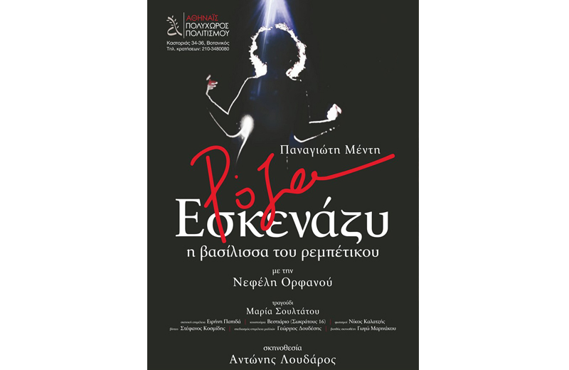 Στο πλαίσιο των εορταστικών εκδηλώσεων του Δήμου Αθηναίων, ο Πολυχώρος Πολιτισμού Αθηναΐς συνεργάζεται με τον Οργανισμό Πολιτισμού, Αθλητισμού και Νεολαίας του Δήμου Αθηναίων και προσφέρει τη μουσική παράσταση «Ρόζα Εσκενάζυ, Η βασίλισσα του Ρεμπέτικου» του Παναγιώτη Μέντη με τη Νεφέλη Ορφανού σε σκηνοθεσία Αντώνη Λουδάρου, τη Δευτέρα 12 Δεκεμβρίου στις 21:15. Κρατήσεις θέσεων στο τηλέφωνο 210 3480080, καθημερινά 17.00 - 22.00 Ένα συγκλονιστικό έργο για την "βασίλισσα" του ρεμπέτικου τραγουδιού. Την «Ρόζα την ναζιάρα με τα σγουρά μαλλιά» που ήξερε πώς να ξεσηκώνει τα πλήθη. Το «Χαρικλακι» της, η «Δημητρούλα» της, η «Λιλή την σκανδαλιάρα», το «Ράμπι-Ράμπι» και τόσες άλλες μεγάλες επιτυχίες της που ακούγονται και στην παράσταση μας ταξιδεύουν από την Κωνσταντινούπολη του 1883 μέχρι την Αθήνα του 1980 . Η Ρόζα, χαρισματική ερμηνεύτρια του ρεμπέτικου και του σμυρναίικου τραγουδιού, έζησε μια ζωή γεμάτη ένταση και μυστήριο. Η Ρόζα βίωσε τις πιο σημαντικές δεκαετίες της ιστορίας της Ελλάδας. Πέρασε δια πυρός και σιδήρου μέσα από πολέμους, κατοχή, αντίσταση, δικτατορίες κι έρωτες, χωρίς να πάψει ούτε στιγμή να είναι μια γυναίκα που δεν σήκωνε μύγα στο σπαθί της. Ρόζα η παραβατική, η απρόβλεπτη. Με αληθινό "φως" όμως... Το "φως" της Ρόζας καίει ακόμα και θεραπεύει ψυχές. Η φωνή της, φάρος για τις επόμενες γενιές, μας διατάζει σαν γνήσια βασίλισσα, πως να γλεντάμε, πως να πίνουμε, και πως να αγαπάμε. Συντελεστές: Το εξαιρετικό έργο υπογράφει ο Παναγιώτης Μέντης Τη σκηνοθεσία ο Αντώνης Λουδάρος «Ρόζα» η Νεφέλη Ορφανού Στα τραγούδια της παράστασης η φωνή της Μαρίας Σουλτάτου και της μικρής Παναγιώτας Ζαρείφη. Στην παράσταση ακούγονται οι ηθοποιοί: (με αλφαβητική σειρά): Θανάσης Κουρλαμπάς, Φανης Μουρατίδης, Θοδωρής Μπουζικάκος, Παύλος Ορκόπουλος, Γιάννης Στάνκογλου. Την σκηνική επιμέλεια έχει η Ειρήνη Παπιδά Τα κοστούμια επιμελείται το Βεστιάριο (Σωκράτους 16, Αθήνα) Τους φωτισμούς σχεδίασε ο Νίκος Καλατζής Video παράστασης Στέφανος Κοσμίδης Σχεδιασμός-επιμέλεια μαλλιών: Γεώργιος Δουδέσης Βοηθός σκηνοθέτη η Γωγώ Μαρινάκου Πολυχώρος Πολιτισμού Αθηναΐς-Μουσικοθεατρική Σκηνή Καστοριάς 34-36, Βοτανικός