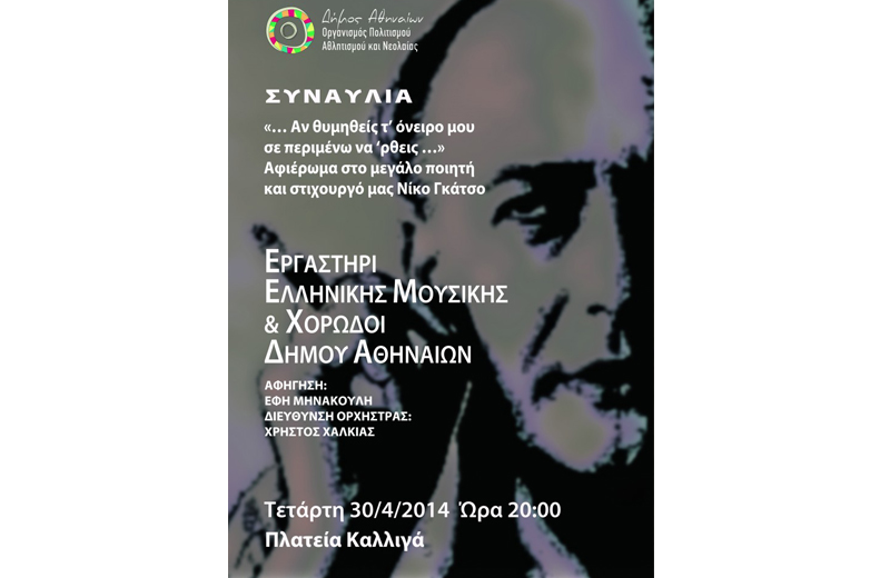 Την Τετάρτη 30 Απριλίου στις 20:00 το Εργαστήρι Ελληνικής Μουσικής συμμετέχει στην εκδήλωση με θέμα την αναβίωση της Πρωτομαγιάς που διοργανώνει η Ένωση Πολιτών Πλατείας Καλλιγά. Θα παρουσιαστούν τραγούδια διακεκριμένων Ελλήνων συνθετών σε στίχους του μεγάλου ποιητή Νίκου Γκάτσου. Πλατεία Καλλιγά (Ευπαλίνου & Σακελλαρίδη)