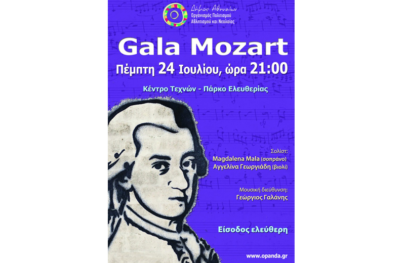 Συμφωνική Ορχήστρα Δήμου Αθηναίων "Gala Mozart" Πέμπτη 24 Ιουλίου Εξωτερικός χώρος Κέντρου Τεχνών - Πάρκο Ελευθερίας Ώρα έναρξης: 9μ.μ. Είσοδος ελεύθερη Μουσικές από τα επικά έργα, ενός από τους μεγαλύτερους μουσικούς συνθέτες της κλασικής μουσικής, του Wolfgang Amadeus Mozart, θα πλημμυρίσουν τον κήπο του Κέντρου Τεχνών, σε μία συναυλία με την οποία η Συμφωνική Ορχήστρα του Δήμου Αθηναίων θα αποχαιρετήσει το κοινό για τη φετινή καλλιτεχνική περίοδο. Τη Συμφωνική Ορχήστρα θα πλαισιώσουν η σολίστ Αγγελίνα Γεωργιάδη (βιολί) και η σοπράνο Magdalena Mala. Μουσική Διεύθυνση: Γεώργιος Γαλάνης Κέντρο Τεχνών Δήμου Αθηναίων: Βασ. Σοφίας – Πάρκο Ελευθερίας, στάση Μετρό: Μέγαρο Μουσικής, τηλ.: 210 7224028