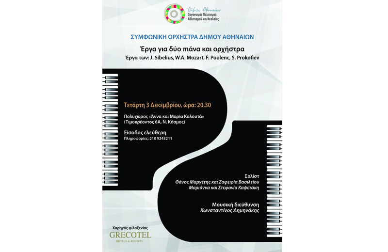 Συμφωνική Ορχήστρα Δήμου Αθηναίων Μεγάλες Μορφές του Μουσικού Κλασικισμού Τετάρτη 3 Δεκαμβρίου, ώρα: 20:30 Πολυχώρος "Άννα και Μαρία Καλουτά" Είσοδος ελεύθερη Πιστή στο ραντεβού της με τους μεγάλους συνθέτες που άφησαν το στίγμα τους στην κλασική μουσική,η Συμφωνική Ορχήστρα παρουσιάζει άλλη μία μοναδική συναυλία κλασικής μουσικής με έργα για δύο πιάνα και ορχήστρα. Κορυφαίοι ηγέτες της κλασικής μουσικής πρωταγωνιστούν σε μία μαγική μουσική βραδιά, όπου θα ακουστούν έργα των συνθετών J. Sibelius, W.A. Mozart, F. Poulenc και S. Prokofiev. Σολίστ: Θάνος Μαργέτης και Ζαφειρία Βασιλείου, Μαριάννα και Στεφανία Κατεψάκη Μουσική διεύθυνση: Κωνσταντίνος Δημηνάκης Πολυχώρος Δήμου Αθηναίων «Άννα & Μαρία Καλουτά»: Τιμοκρέοντος 6α – Νέος Κόσμος, τηλ.: 210 9344131