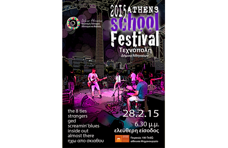 Οι μαθητές της Αθήνας ανανεώνουν το ραντεβού τους με τη σκηνή, στο Athens School Festival που διοργανώνει ο Οργανισμός Πολιτισμού, Αθλητισμού και Νεολαίας του Δήμου Αθηναίων, το Σάββατο 28 Φεβρουαρίου τις 6.30μ.μ. στην Τεχνόπολη του Δήμου Αθηναίων. Στο μουσικό θεσμό, που έχουν λατρέψει μικροί και μεγάλοι, συμμετέχουν συγκρότημα μαθητών Γυμνασίου και Λυκείου της Αθήνας, οι οποίοι ξεδιπλώνουν και αναδεικνύουν το ταλέντο τους σε κάθε συναυλία. Εναλλάσσοντας διαφορετικά είδη μουσικής (έντεχνο, παραδοσιακό, rock, metal, garage, κ.α.), οι μαθητές ταξιδεύουν με τις μελωδίες τούς ακροατές στον κόσμο της μουσικής και τους αφήνουν κατάπληκτους με την ενέργεια και τις μουσικές τους ικανότητες. Τα συγκροτήματα που θα πάρουν μέρος στη συναυλία είναι τα εξής: the 8 ties strangers ged screamin’ blues inside out almost there ηχω απο σκιαθου Η συναυλία πραγματοποιείται με την υποστήριξη της Τεχνόπολης του Δήμου Αθηναίων. Η είσοδος για το κοινό είναι ελεύθερη. Τεχνόπολη Δήμου Αθηναίων (Αίθουσα Μηχανουργείο): Πειραιώς 100, Γκάζι, τηλ.:210 3475518
