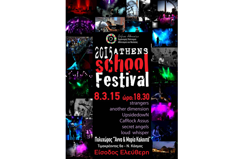 Οι μαθητές της Αθήνας ανεβαίνουν και πάλι στη σκηνή, αυτή τη φορά στον Πολυχώρο Δήμου Αθηναίων «Άννα & Μαρία Καλουτά», την Κυριακή 8 Μαρτίου στις 6.30μ.μ., για να δώσουν το δικό τους παρόν στον αγαπημένο μουσικό θεσμό του Athens School Festival. Στο Φεστιβάλ συμμετέχουν συγκροτήματα μαθητών Γυμνασίου και Λυκείου της Αθήνας, τα οποία εντυπωσιάζουν τους ακροατές με το ταλέντο, την ενέργεια και την αγάπη τους για τη μουσική. Κάθε συναυλία αποτελεί για τα μαθητικά συγκροτήματα, μία μοναδική εμπειρία, αλλά και μία ευκαιρία να συστηθούν στο κοινό, να μοιραστούν μαζί του τις μουσικές τους και να στείλουν τα δικά τους μηνύματα με τον πιο όμορφο τρόπο. Τα συγκροτήματα που θα πάρουν μέρος στη συναυλία είναι τα εξής: strangers another dimension UpsidedowN CafRock Assus secret angels loud whisper Η είσοδος για το κοινό είναι ελεύθερη. Πολυχώρος Δήμου Αθηναίων «Άννα & Μαρία Καλουτά»: Τιμοκρέοντος 6α, Νέος Κόσμος, τηλ.: 210 9344131