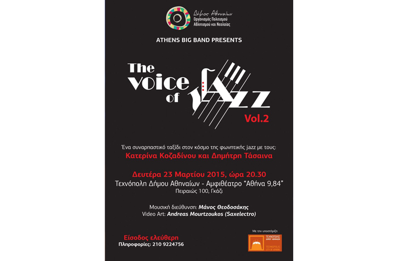The Voice of Jazz Vol. 2 Συναυλία της Big Band του Δήμου Αθηναίων στην Τεχνόπολη Συνεχίζεται η μουσική διαδρομή του Οργανισμού Πολιτισμού, Αθλητισμού και Νεολαίας του Δήμου Αθηναίων στον κόσμο της jazz με συνταξιδιώτες τους λάτρεις του ατμοσφαιρικού αυτού μουσικού είδους στη νέα συναυλία The Voice of Jazz Vol. 2” της Big Band, που παρουσιάζει τη  Δευτέρα 23 Μαρτίου στις 8.30 μ.μ. στο Αμφιθέατρο του «Αθήνα 9.84» στην Τεχνόπολη του Δήμου Αθηναίων. Στις συναυλίες της δεύτερης σειράς “The Voice of Jazz ”, η Big Band συμπράττει με διακεκριμένους τραγουδιστές από τον χώρο της jazz και σε αυτή τη μουσική βραδιά θα φιλοξενήσει δύο από τους πιο ταλαντούχους ερμηνευτές του χώρου, την Κατερίνα Κοζαδίνου και το Δημήτρη Τάσαινα, που θα ταξιδέψουν τους ακροατές στη φωνητική jazz. Μουσική Διεύθυνση: Μάνος Θεοδοσάκης Video Art: Andreas Mourtzoukos (Saxelectro) Η Big Band του Δήμου Αθηναίων ιδρύθηκε το 1998 με πρωτοβουλία του βιρτουόζου πιανίστα Γιάννη Τερεζάκη και είναι ένα από τα τέσσερα Μουσικά Σύνολα του Οργανισμού Πολιτισμού, Αθλητισμού και Νεολαίας. Το ρεπερτόριό της περιλαμβάνει ιστορικές συνθέσεις και ενορχηστρώσεις των πρωτοπόρων δημιουργών της μουσικής φιλολογίας για σύνολο Big Band και καλύπτει ένα ευρύ φάσμα των μουσικών ρευμάτων της τζαζ. Η Big Band έχει παίξει σε όλες τις μεγάλες αίθουσες και φεστιβάλ μουσικής και τεχνών στην Αθήνα, Θεσσαλονίκη και στην ελληνική περιφέρεια. Την έχουν διευθύνει κορυφαίοι μαέστροι και συνθέτες της τζαζ και σύγχρονης μουσικής, όπως οι William Russo και  Don Owens, ενώ έχει πραγματοποιήσει συνεργασίες με διακεκριμένους Έλληνες και ξένους σολίστες, όπως οι Bobby Shew, Vince DiMartino, Veronica Mortensen, Rex Richardson, Fred Hemke Jr, Chico Freeman, Mark Smith, Τάκης Πατερέλης, Γιώργος Κοντραφούρης, Χρήστος Ραφαηλίδης, Γιώτης Σαμαράς κ.ά. Οι μουσικοί που απαρτίζουν την Big Band έχουν επιλεγεί μεταξύ των ικανότερων Ελλήνων σολίστ και διακρίνονται για την υψηλή δεξιοτεχνία τους στον αυτοσχεδιασμό και την ευελιξία τους στην ερμηνεία των διαφορετικών ρευμάτων της τζαζ. Η είσοδος για το κοινό είναι ελεύθερη. Για περισσότερες πληροφορίες : 210 9224756 Η συναυλία πραγματοποιείται με την υποστήριξη της Τεχνόπολης του Δήμου Αθηναίων. Τεχνόπολη Δήμου Αθηναίων: Πειραιώς 100, Γκάζι, 210 3475518, 210 3453548 Πρόσβαση: Μετρό: Σταθμός «Κεραμεικός», Τρόλεï: No. 21 (από Ομόνοια), Στάση «Φωταέριο», Λεωφορεία: 049, 815, 838, 914, Β18, Γ18, Στάση «Φωταέριο»