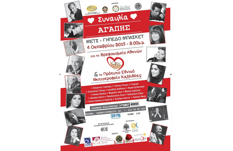 Ο Όμιλος για την Unesco Τεχνών Λόγου και Επιστημών Ελλάδος, ο Οργανισμός Πολιτισμού, Αθλητισμού και Νεολαίας του Δήμου Αθηναίων και ο Δήμος Καλλιθέας διοργανώνουν συναυλία αγάπης για το Δημοτικό Βρεφοκομείο Αθηνών και το Πρότυπο Εθνικό Νηπιοτροφείο Καλλιθέας την Κυριακή 4 Οκτωβρίου στις 8μ.μ. στο γήπεδο «Παναγιώτης Γκάζγκας» – ΜΕΤΣ, υπό την αιγίδα της Ιεράς Αρχιεπισκοπής Αθηνών και της Περιφέρειας Αττικής, με την υποστήριξη της Ένωσης Τραγουδιστών Ελλάδος. Στη συναυλία, τα έσοδα της οποίας θα διατεθούν για την οικονομική ενίσχυση του Δημοτικού Βρεφοκομείου Αθηνών και του Πρότυπου Εθνικού Νηπιοτροφείου Καλλιθέας, οι αγαπημένοι καλλιτέχνες Γεράσιμος Ανδρεάτος, Πέτρος Γαϊτάνος, Γλυκερία, Γιάννης Ζουγανέλης, Αγάθωνας Ιακωβίδης, Νεκταρία Καραντζή, Βασίλης Λέκκας, Άννα Μορφίδου, Δημήτρης Μπάσης, Λιζέτα Νικολάου, Πίτσα Παπαδοπούλου, Σοφία Παπάζογλου, Βασίλης και Σαράντης Σαλέας, Κώστας Σκόνδρας, Λάκης Χαλκιάς, Κώστας Χατζής και Γιώργος Παγιάτης (ενορχήστρωση) συναντούνται αφιλοκερδώς στη σκηνή για να διασκεδάσουν το κοινό σε μία μοναδική, γεμάτη αγάπη για τα παιδιά μουσική βραδιά με παρουσιαστή τον Αλέξη Κωστάλα. Κόστος εισιτηρίου: 10€ Η διάθεση των εισιτηρίων πραγματοποιείται στο Ticket House και TicketPro. Για περισσότερες πληροφορίες οι ενδιαφερόμενοι μπορούν να καλούν στο τηλ. 210 9514523 (9.00 -14.00). Γήπεδο «Παναγιώτης Γκάζγκας» – ΜΕΤΣ Μάρκου Μουσούρου 70, τηλ. 210 7512400 & 210 8239021