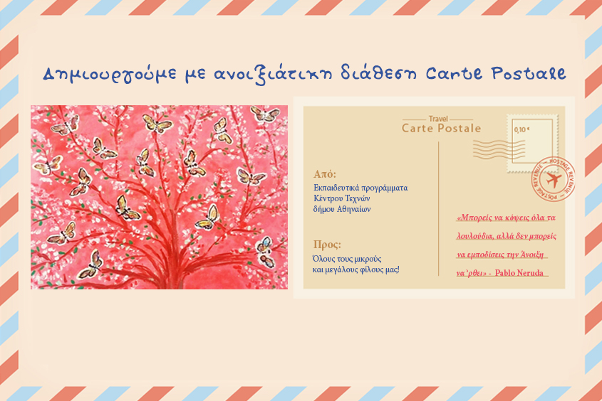Ο Οργανισμός Πολιτισμού, Αθλητισμού και Νεολαίας συνεχίζει να έρχεται στο σπίτι σας, αυτή τη φορά με άλλη μια εκπαιδευτική δράση για όλη την οικογένεια και σας προσκαλεί να δημιουργήσετε carte postale με ανοιξιάτικη διάθεση!