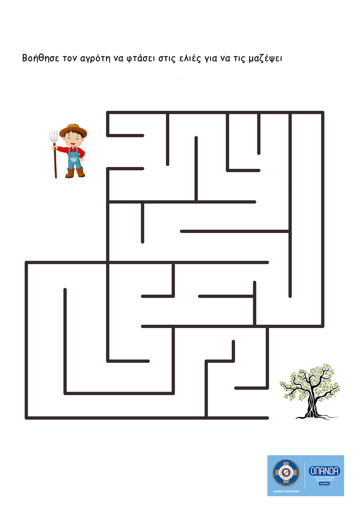 - Βοήθησε τον αγρότη να φτάσει στις ελιές για να τις μαζέψει (εδώ θα μπει ο σύνδεσμος με τον λαβύρινθο). Εκτυπώστε το λαβύρινθο εδώ