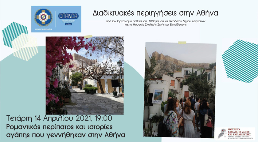 Ο Οργανισμός Πολιτισμού, Αθλητισμού και Νεολαίας του Δήμου Αθηναίων (ΟΠΑΝΔΑ) και το Μουσείο Σχολικής Ζωής και Εκπαίδευσης συνεχίζουν τις θεματικές διαδικτυακές περιηγήσεις στην Αθήνα, την Τετάρτη 14 Απριλίου στις 19:00 με θέμα «Ρομαντικός περίπατος και ιστορίες αγάπης που γεννήθηκαν στην Αθήνα» μέσα από τη σελίδα του ΟΠΑΝΔΑ στο facebook, www.facebook.com/Opanda.gr