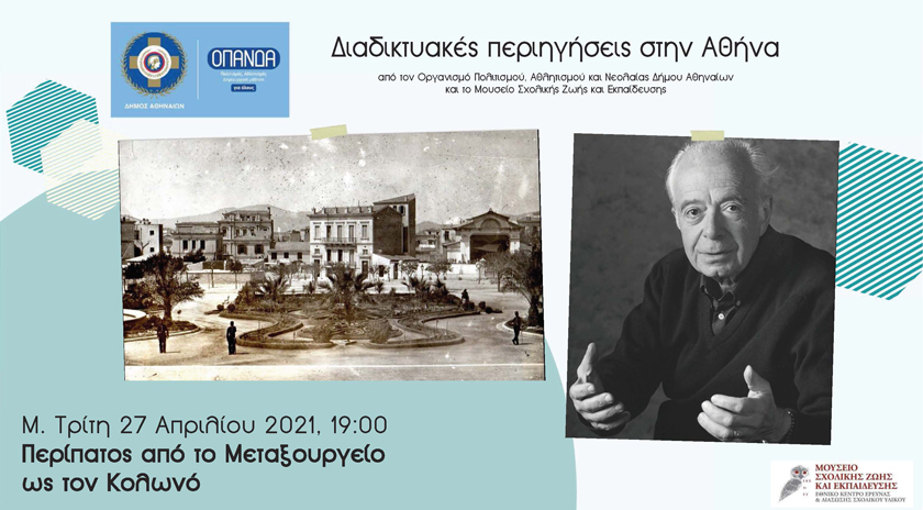 Ο Οργανισμός Πολιτισμού, Αθλητισμού και Νεολαίας του Δήμου Αθηναίων (ΟΠΑΝΔΑ) και το Μουσείο Σχολικής Ζωής και Εκπαίδευσης συνεχίζουν τις θεματικές διαδικτυακές περιηγήσεις στην Αθήνα, τη Μεγάλη Τρίτη Απριλίου στις 19:00 με θέμα "Περίπατος από το Μεταξουργείο ως τον Κολωνό", μέσα από τη σελίδα του ΟΠΑΝΔΑ στο facebook www.facebook.com/Opanda.gr
