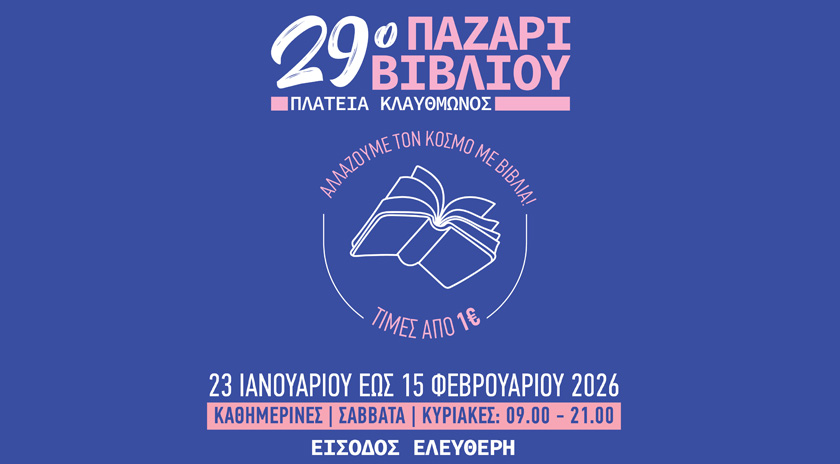 Το 29ο Παζάρι Βιβλίου 2026, θα λειτουργεί καθημερινές, Σάββατα και Κυριακές από τις 09:00 το πρωί έως και τις 21:00 το βράδυ, από 23 Ιανουαρίου έως και 15 Φεβρουαρίου 2026.